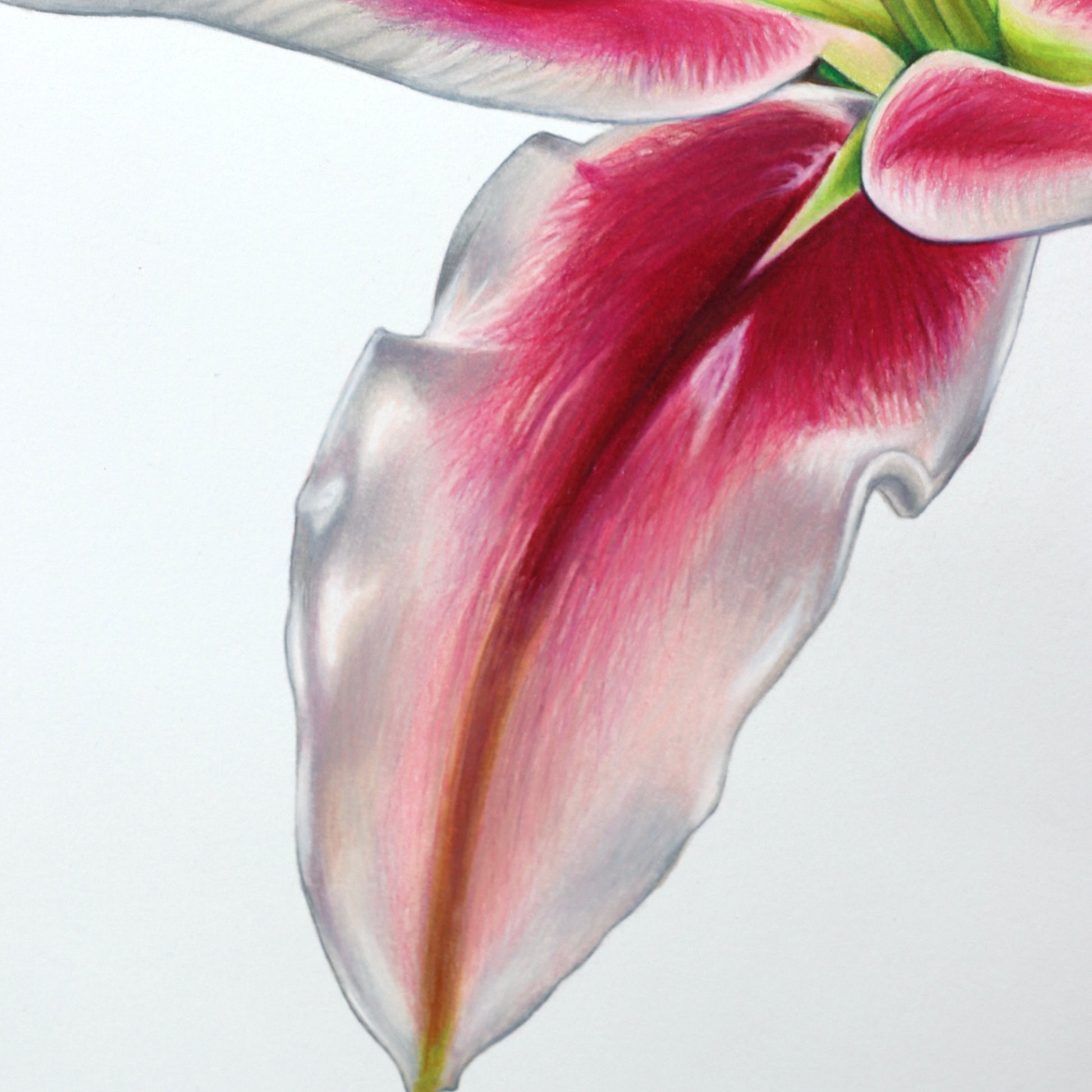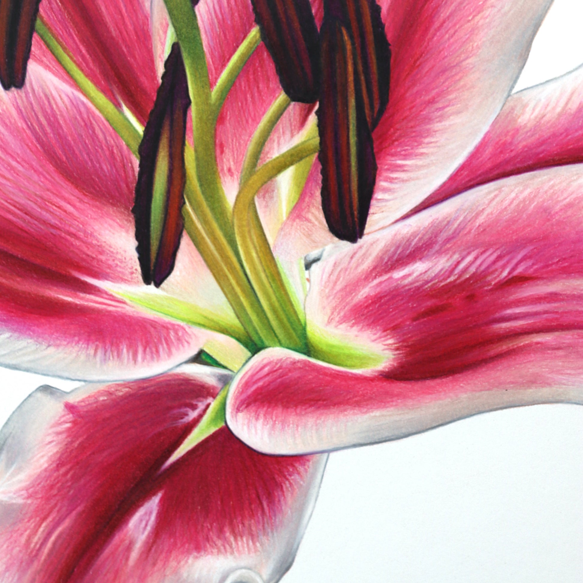 This high-quality print showcases vibrant shades of pink, white/grey and greens - capturing the beauty of nature. Each pencil stroke adds texture and depth, making the flower appear almost lifelike, as if it’s blooming right before your eyes.